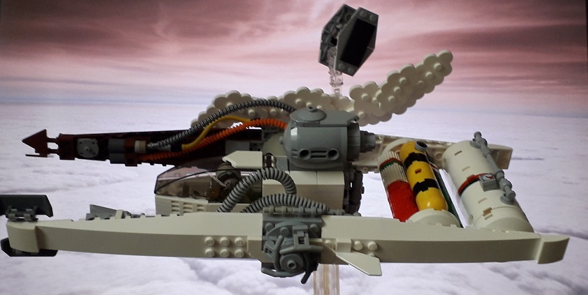 The Cloudrunner is a very basic unarmed atmospheric aircraft with no active device at all (no life support, no shields, no sensors) and it is often jury-rigged because of the corrosiveness of the gazes, it relies only on the pilot skills and a prerecorded holographic course leading to the point of rendez-vous with a space freighter awaiting its precious cargo far beneath the clouds of Zhar. Once the loading is over, the freighter leaves, accelerates inside the atmosphere and jump into hyperspace just after leaving the clouds cover. The goal of the Ties is to spot and reach the Cloudrunner before it can join with the smuggler. And it’s a real challenge because of the poor atmospheric capabilities of the Tie/ln (which is rather designed for space superiority) and the numerous electromagnetic interferences created by the close proximity of Kile and Gall.