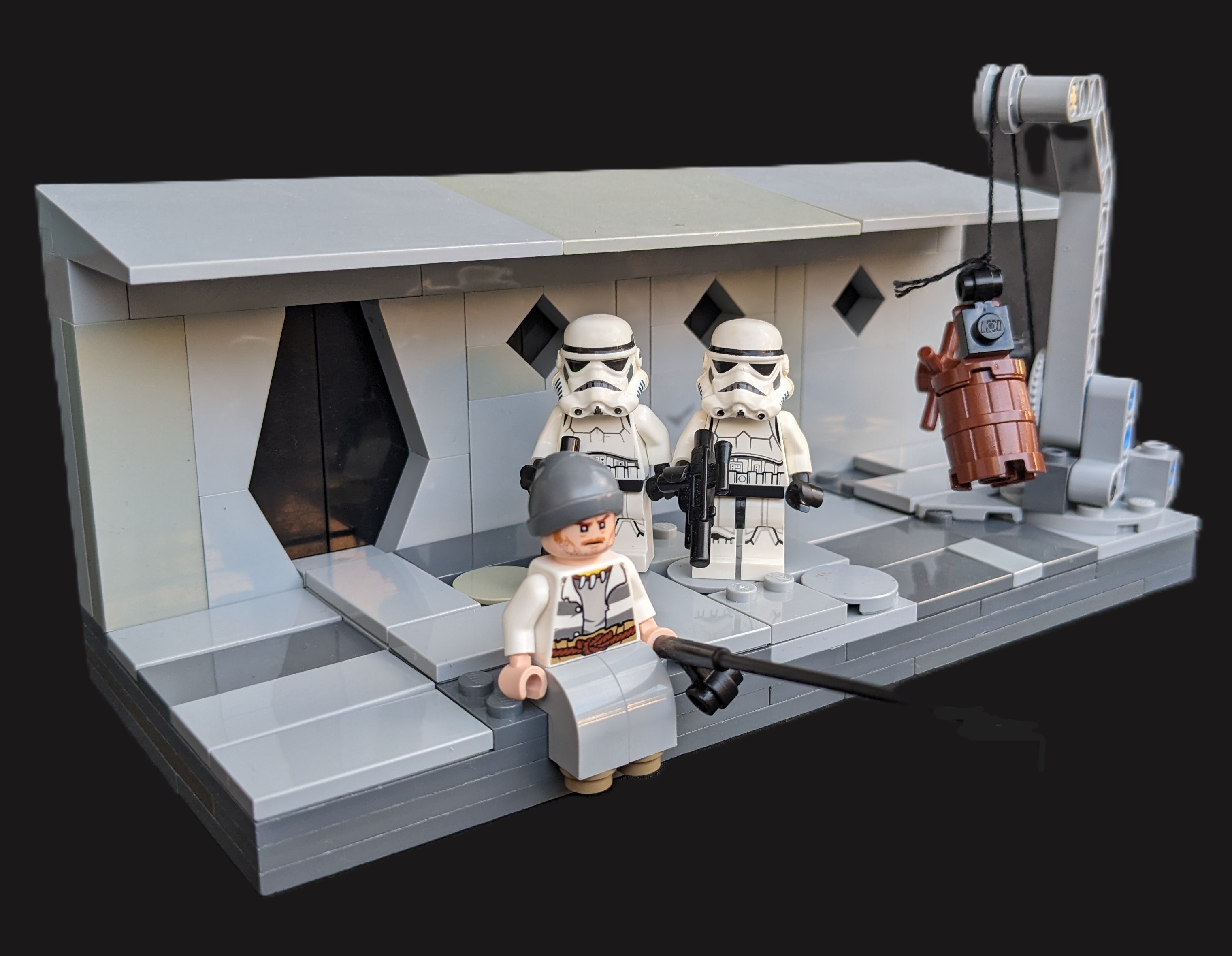 A neat scene! In the future, I'd suggest a few pieces of set dressing to sell that this is Star Wars - especially with buildings, the scene should speak to the setting even without figures. Maybe a more industrial barrel, and something mechanical on the wall.